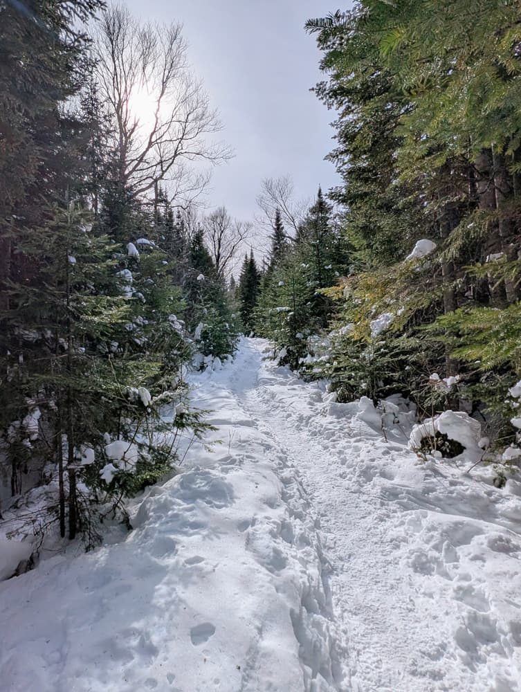 Beginning from the trailhead, the trail climbs very gradually along a dirt path. After 0.5 miles the trail reaches Rock Pond where there is a short trail that leads to the pond. The trail continues for another 0.2 miles before the trail splits with signs indicating the way towards the scenic overlooks and Midway Pond.