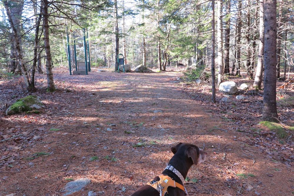 For those less inclined to use the fitness stations, the trail also provides a pleasant and easy walk on a mostly flat surface of gravel, dirt, and pineneedles, with just two spots where there is a small grade. The even surface and wide trail make it suitable for young children, all-terrain strollers, and possibly for some with mobility challenges.