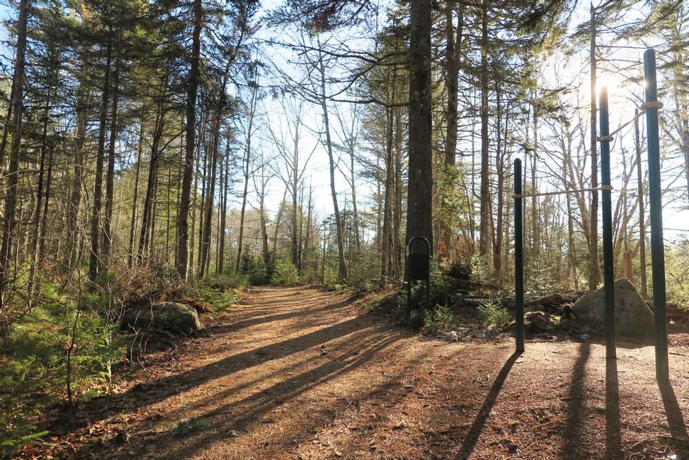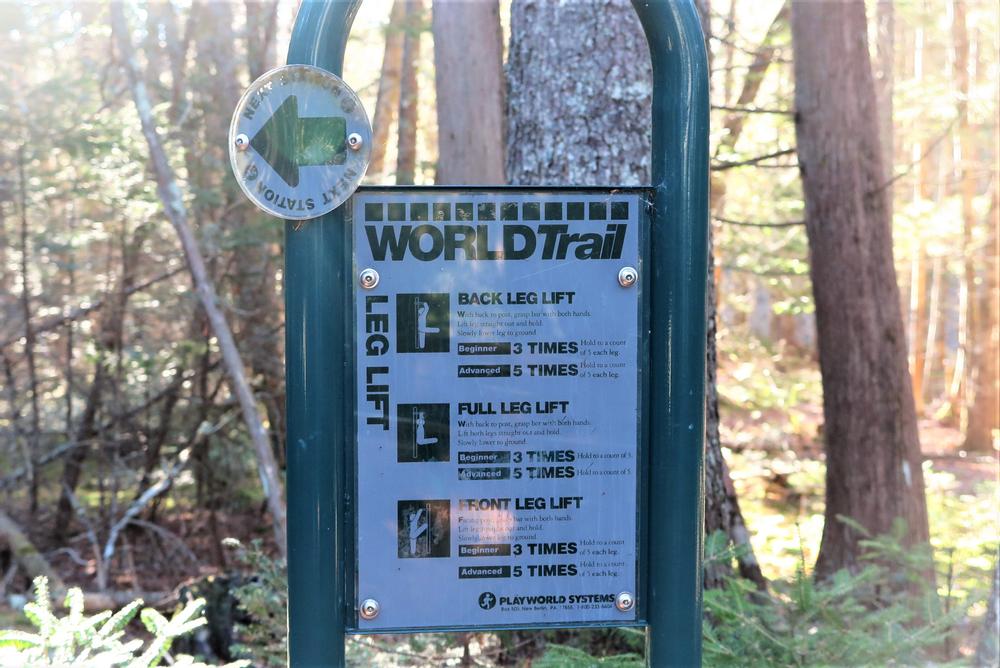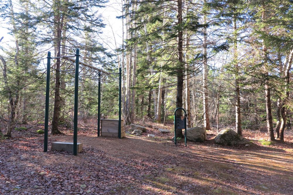 The three quarter-mile trail wends through the woods behind the school. Eleven fitness stations are located along the trail, with both equipment and signage with instructions at each station. Stations include push-ups, sit-ups and body curls, a horizontal loop ladder, and more.