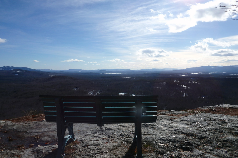 Once at the summit, the southwest side provides several overlooks along immense cliffs that provide outstanding views with several memorial benches where one can enjoy a picnic lunch, watch hawks glide in the thermals, or just take in the breath taking views. At the summit, one can see Kezar Lake, the ski trails of Shawnee Peak, the White Mountains of New Hampshire, and several other great natural features. The overlooks also provide an excellent area to view the spectacular fall colors with sweeping views of the surrounding country side.