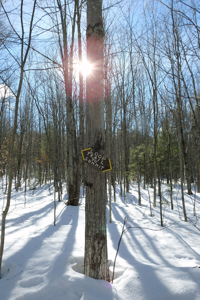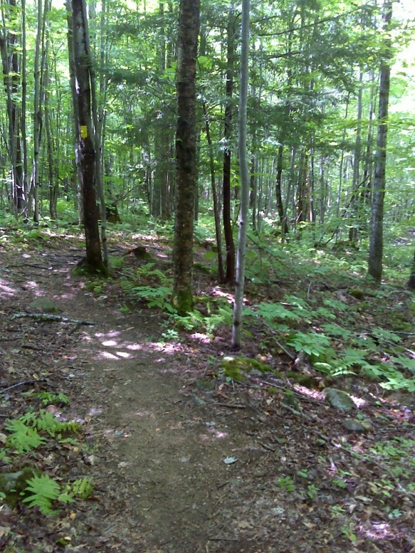The well marked loop trail begins from the parking lot where the trail splits a short distance up the trail. Either path will lead to the summit of Sabattus Mountain. The trail traverses through a mixed growth forest with some moderate climbs over a few sections of exposed roots and ledge. Closer to the summit, the trail becomes less steep and winds through a hemlock/pine growth forest.