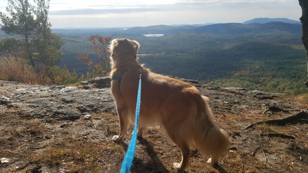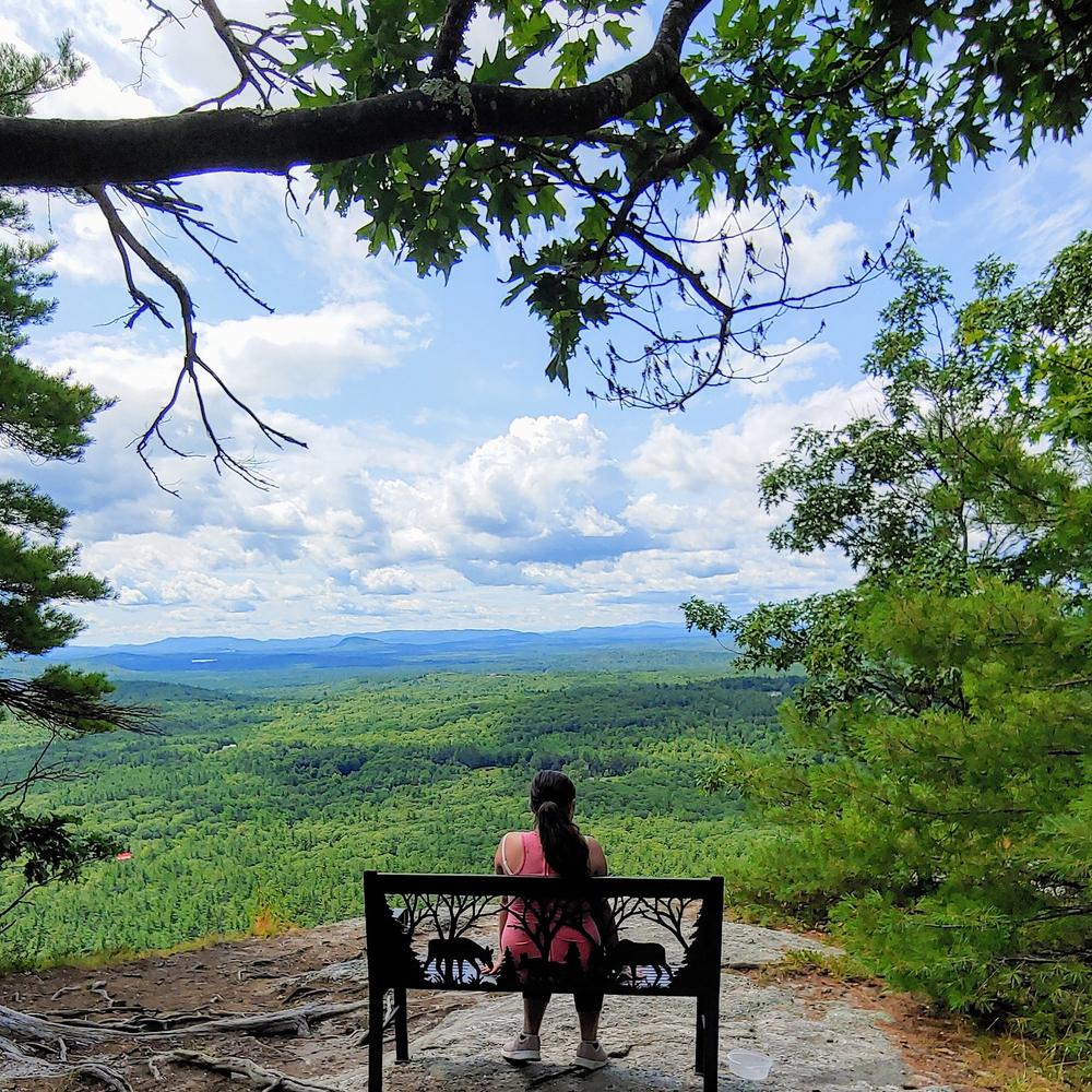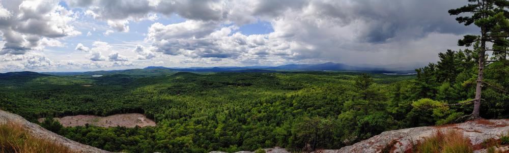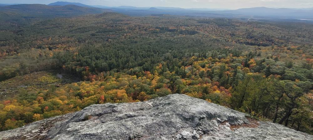 Once at the summit, the southwest side provides several overlooks along immense cliffs that provide outstanding views with several memorial benches where one can enjoy a picnic lunch, watch hawks glide in the thermals, or just take in the breath taking views. At the summit, one can see Kezar Lake, the ski trails of Shawnee Peak, the White Mountains of New Hampshire, and several other great natural features. The overlooks also provide an excellent area to view the spectacular fall colors with sweeping views of the surrounding country side.