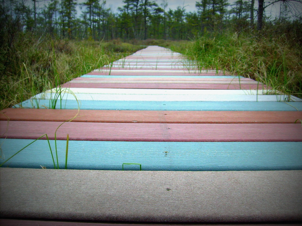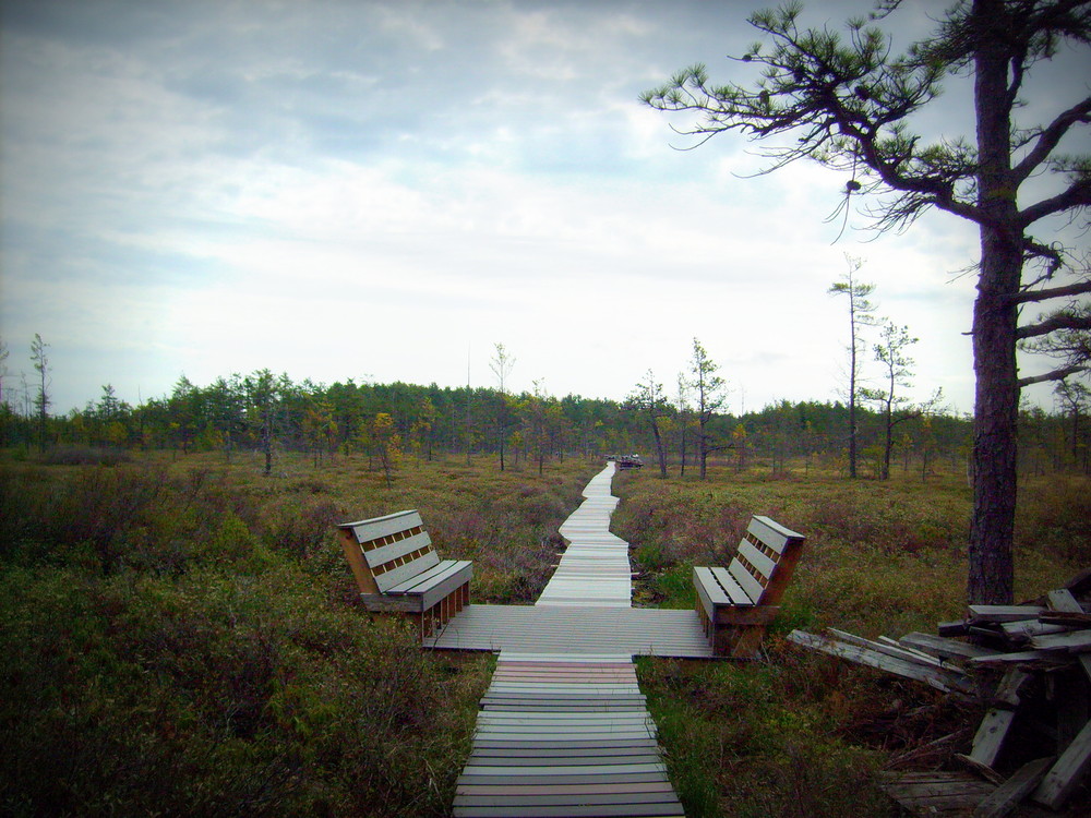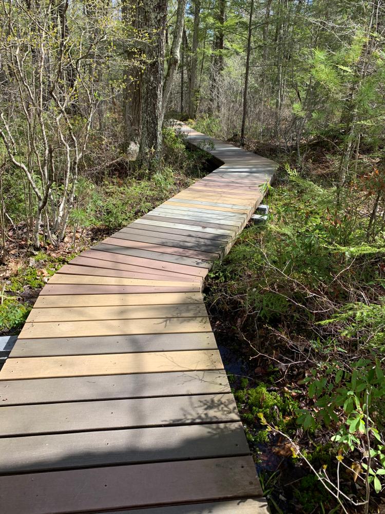 The 1,223-acre Saco Heath Preserve has a 3-foot wide boardwalk trail through a unique raised coalesced bog, which is the southernmost example of its type. The natural surface trail from the parking lot through the forest includes small rocks and roots and there is a smooth onramp transition to the boardwalk. The relatively flat (0-2% slope) boardwalk includes regular benches and pullouts. See Trail Access Information & Considerations below for more information about this Accessible Adventure.