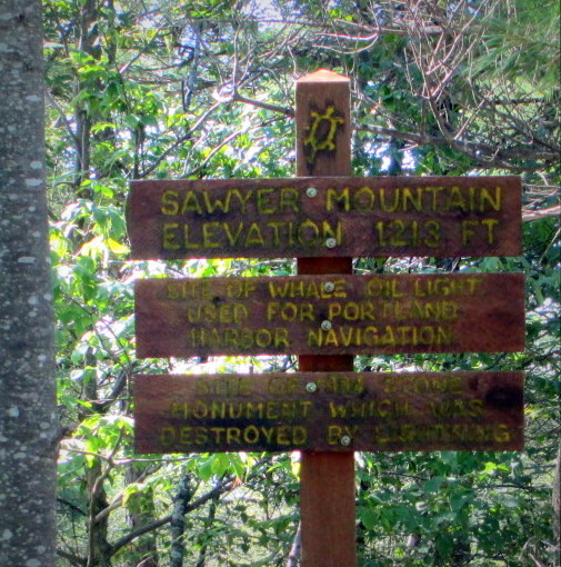 From the parking area on ME-117, the trail (farthest to the right) follows the old discontinued Sawyer Mt Road, marked with red turtles. Just above the Estes Cemetery, the trail continues steeply up a slope, through steep, eroded ravines. Where the old road begins to descend there is a trail to the left leading to the summit.