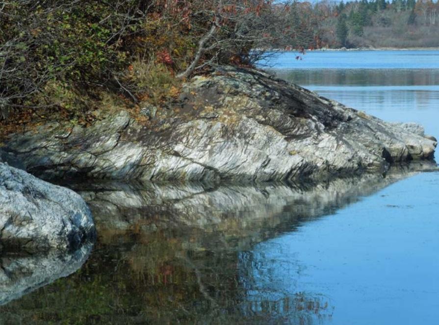 White Rock Point (not accessible at high tide)— a spectacular example of the Ellsworth schist, the bedrock of north Deer Isle. The whitish weathered surface is typical of this formation as are the tightly folded layers in the rocks.