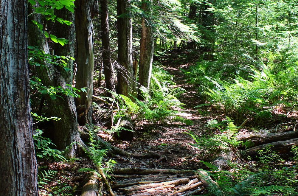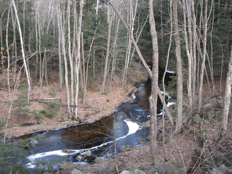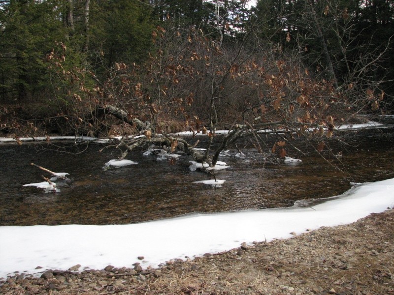 Descending from the parking lot, the trail winds among tall conifer trees and loops around following the nearby brook most of the way. The trail provides several scenic overlooks of the brook as well as access to a gravel bar that is sometimes submerged during high water. There are efforts underway by the school to add interpretive signs about the ecology of the trail.