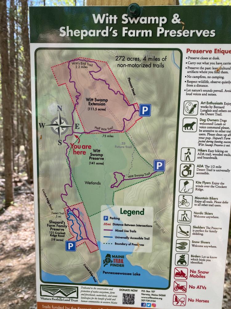 Western Foothills Land TrustShepard's Farm Family Preserve is west of downtown Norway off Crockett Ridge Road. The parking area and trailhead are located 0.5 miles north of ME-117/118 at 121 Crockett Ridge Road. The trailhead and small kiosk are to the right of the parking area.