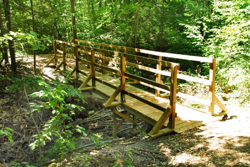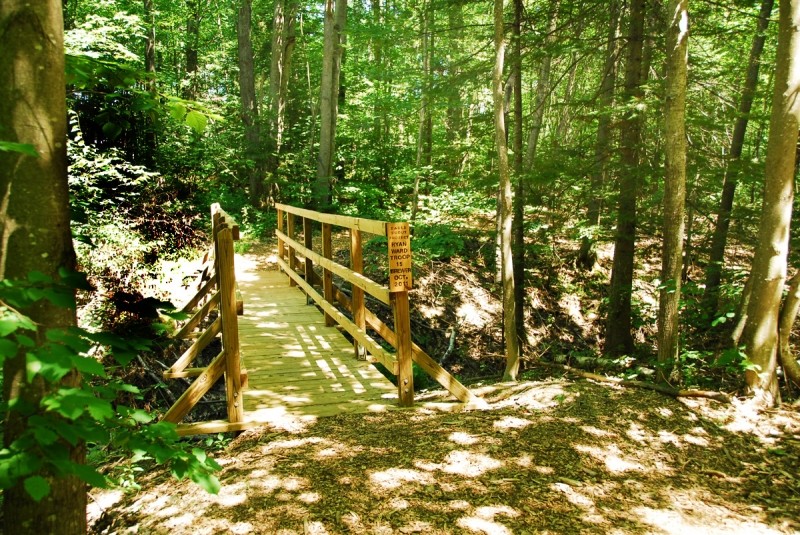 The entrance to the Sherwood loop is obvious, along with a sign indicating it. The trail, which was constructed through a lot of effort to clear the path and to lay down a bed of mulch along the entire route, begins about six feet wide before narrowing to three or four. You'll walk a little way into this thick forest before the loop begins, diverging left and right. To the left is a wooden bridge built by Ryan Ward as his Eagle Scout project for Boy Scouts Troop 15 in October 2011. The bridge crosses a stream bed, alerting you that you're heading into wetlands.