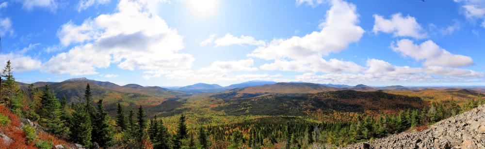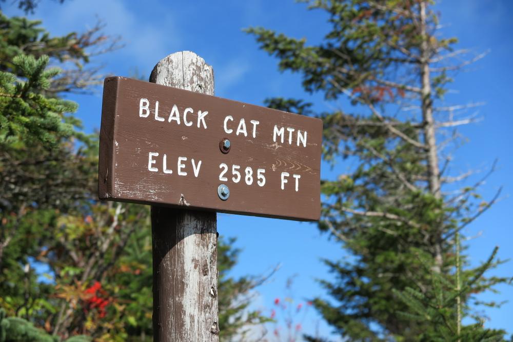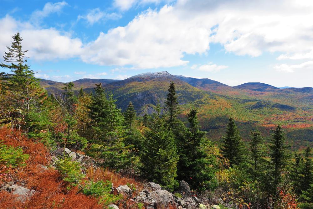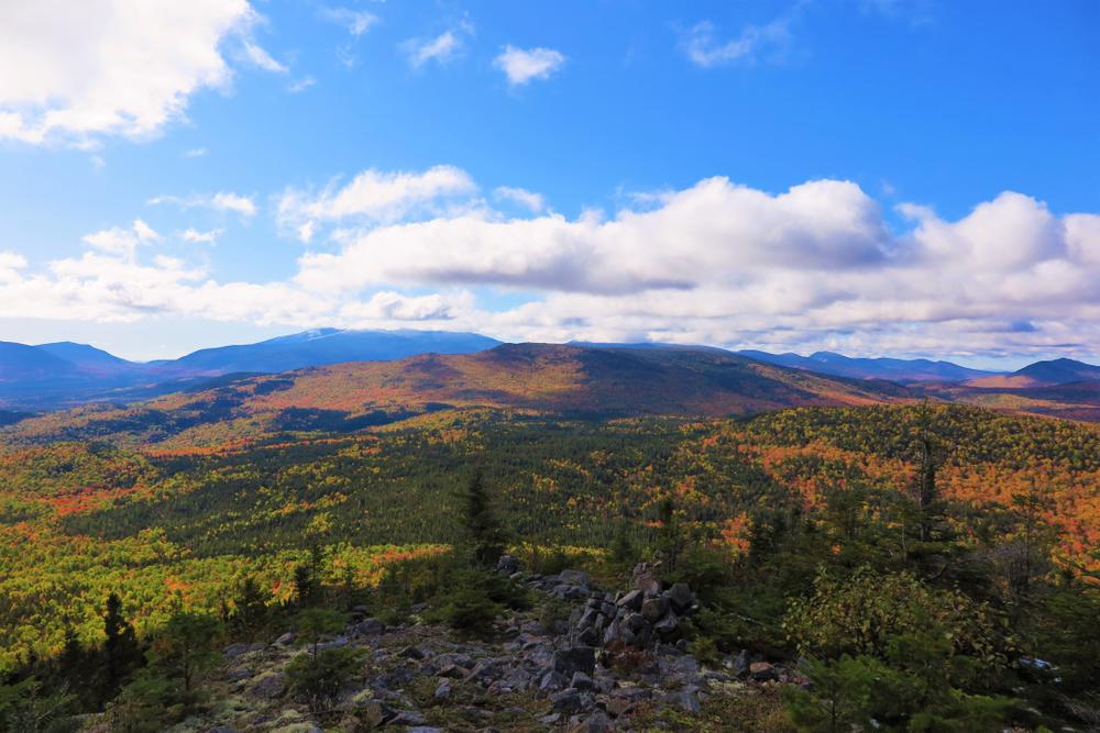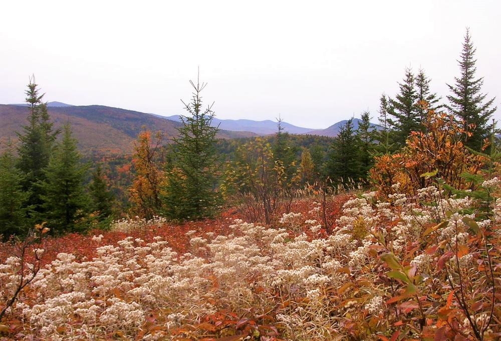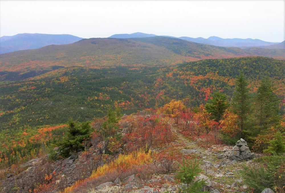 2.6 Miles: The trail reaches the South Peak of South Branch Mountain, also called Black Cat Mountain (elevation 2,585 feet). The 360-degree view is outstanding, especially of Pogy Notch and the South Branch Ponds. The trail continues down the south ridge passing through beautiful open meadows.