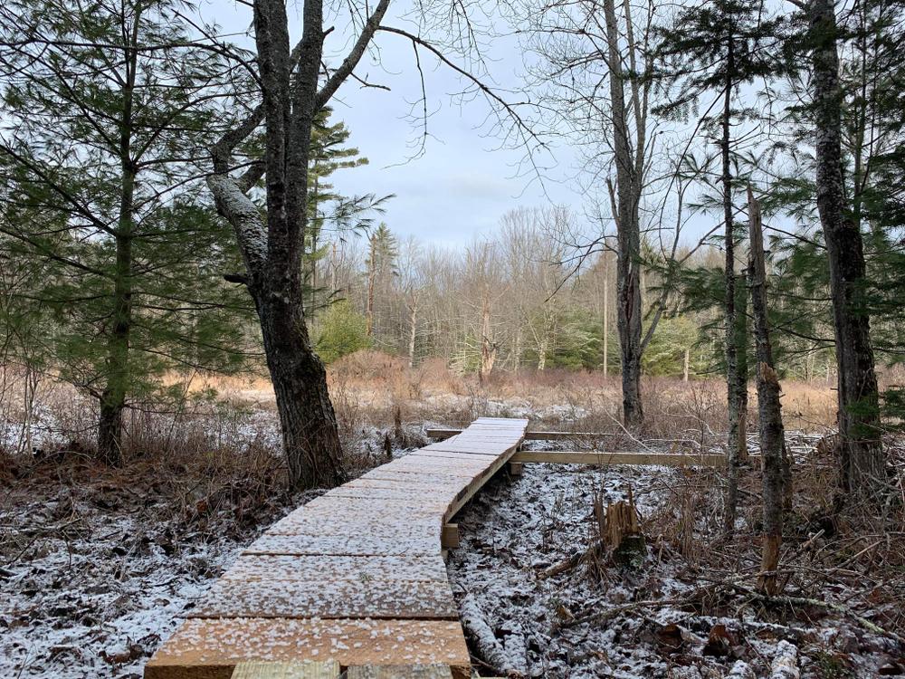 Excepting the red spur trail to Tucker Brook, the trails are wide and flat, with a grade of no more than about 2%. There are no bog bridges or other notable obstacles on these primary trails, though the surface may become soft in wetter seasons. The wooded sections of the trail network have uneven terrain.