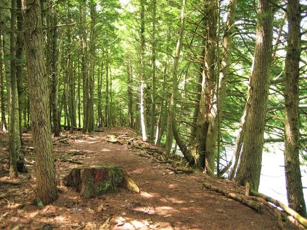 This short, easy loop meanders through old-field pines, mixed conifer-hardwood stands with extensive bog-bridging, and along a wild section of the Passagassawekeag River. This section of the river, less than a quarter mile from the trailhead, is the last section of rapids before the river becomes tidal, and has ferns and mosses growing along its banks. Old stone walls, apple trees, and multi-trunk pine trees offer evidence of past farming. Brown ash trees, a slow-growing tree used by Wabanaki people for basket weaving, are found along the trail.