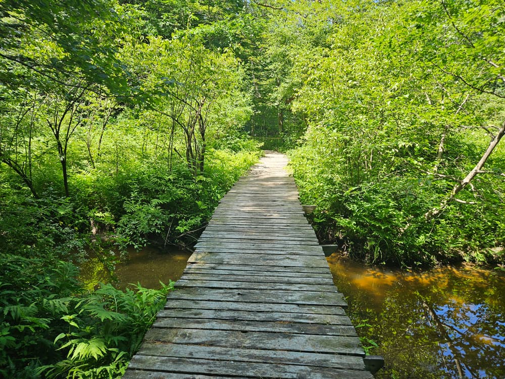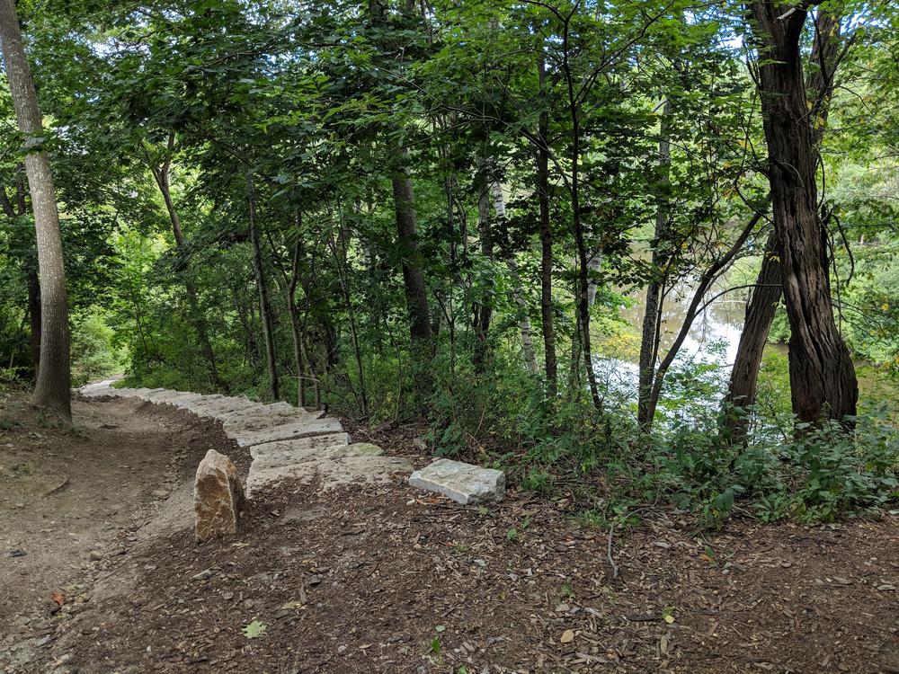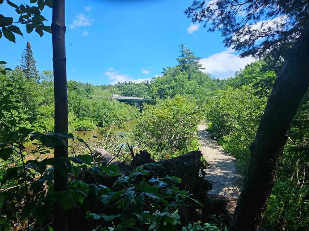The Stroudwater Trail connects the Portland peninsula to the Westbrook City Line. This trail is heavily wooded with both flat and hilly sections. The surface is gravel and packed earth. Benches have been provided at scenic outlooks. The west end of trail between Blueberry Road and Hutchins Drive is closed in winter as it crosses through one of Portland’s few remaining deer yards and provides valuable deer habitat during the winter months. The trail crosses under the Maine Turnpike behind the UNUM campus and continues east along the river at a flat slope, with boardwalks traversing wet areas. Near the River’s Edge Drive trailhead, the gravel trail ascends up a steep grade via stairs to reach Congress Street.