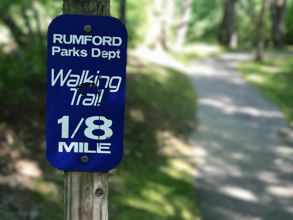 The walking trail is located near the intersection of US-2 and ME-120 (Lincoln Ave and Hancock Street) in Rumford. Take ME-120 (Hancock Street) north from the intersection. Take the next right onto Strafford Avenue. Continue straight for another 0.1 miles before reaching the athletic fields. There is parking all along Hosmer Lane, but parking near the football field puts you closest to the two southern trailheads, located on the far side of the football field. The paved parking lot includes ADA-designated spaces, and is on level with the track around the field, from which both trailheads may be reached. At the southern trailhead the trail leaves directly from the track through a gate in the fence. Both trailheads are well marked with signs.