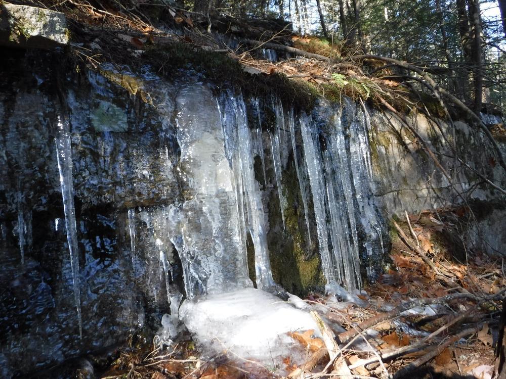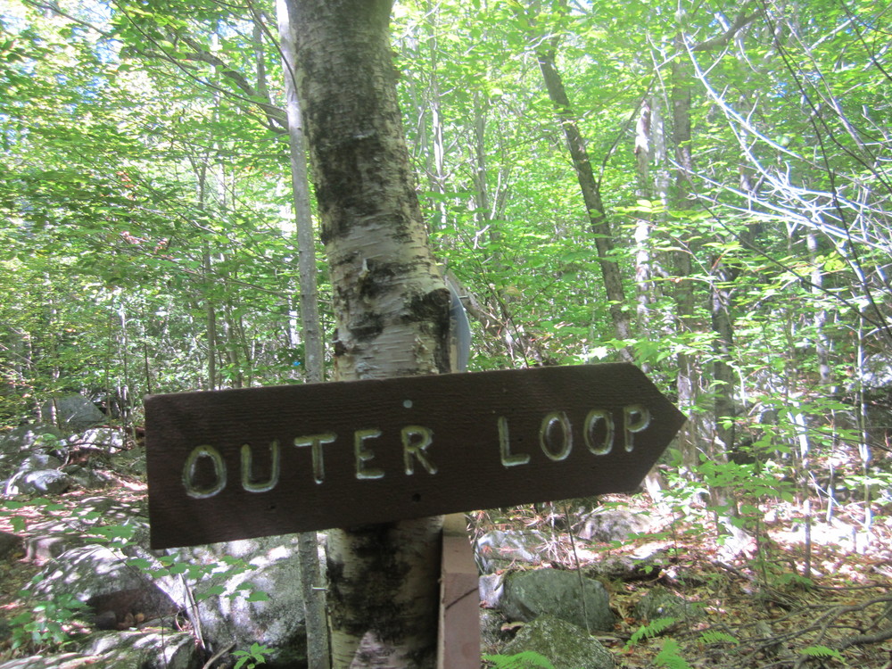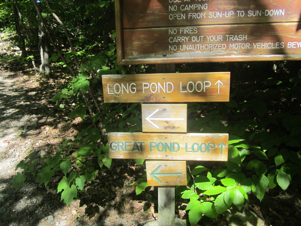 The Great Pond Loop (0.4 miles, green arrow) enters the woods on the right (east) 0.4 miles from the south parking area. The trail climbs as it winds through a glacial boulder field to a small open area—the highest point on The Mountain at 665 feet. The trail continues north and west, dropping down to rejoin the main trail at its end.