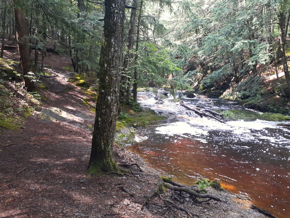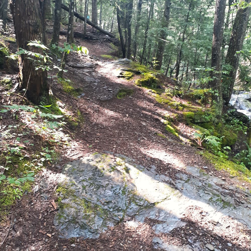 This network features a granite monument, information about the history of the Thurston Mill, a wooded walk to an overlook of the river and rapids, and a short walk to a small waterfall.