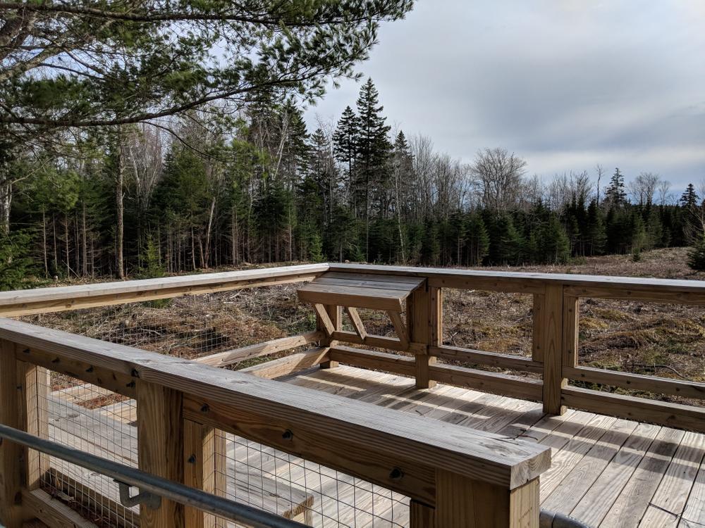 The Timberdoodle Trail travels just over 0.1 miles between the partially paved parking lot and the viewing platform along smooth, wide, and level graded pavement. Conifers and field grasses hug the sides of the gently winding trail. The sturdy wooden viewing platform features a wheelchair accessible ramp and hand rails and offers a relaxing vantage from which to observe the birds and other wildlife that inhabit the forests of the Moosehorn National Wildlife Refuge. The view overlooks a regenerating clearing maintained at an early successional stage to provide habitat preferred by the American Woodcock (aka, Timberdoodle).