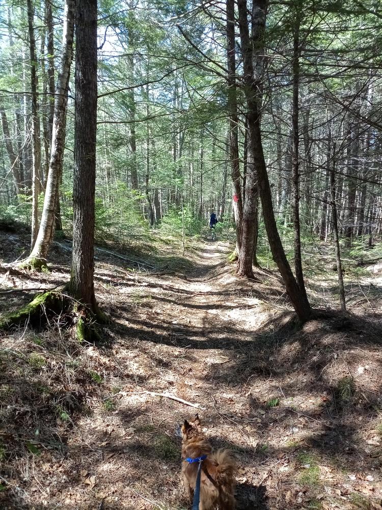 Blue Trail (0.7 mile loop, easy): The Blue Trail leaves the parking lot and follows the historic Wiscasset, Waterville, Farmington (WWF) railroad right-of-way to Trout Brook. The trail heads up the hill to the right into a forest of pines and then through early succession forestland. The easy hike follows old logging roads in places, and through what was once farmland until the mid-1900’s. The trail follows the high point of land, past the turn-off for the Red Trail, before looping down the hill and back towards the parking lot. The trail comes back out on the WWF path before arriving back at the parking lot.