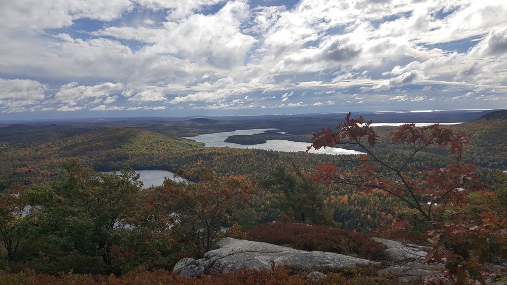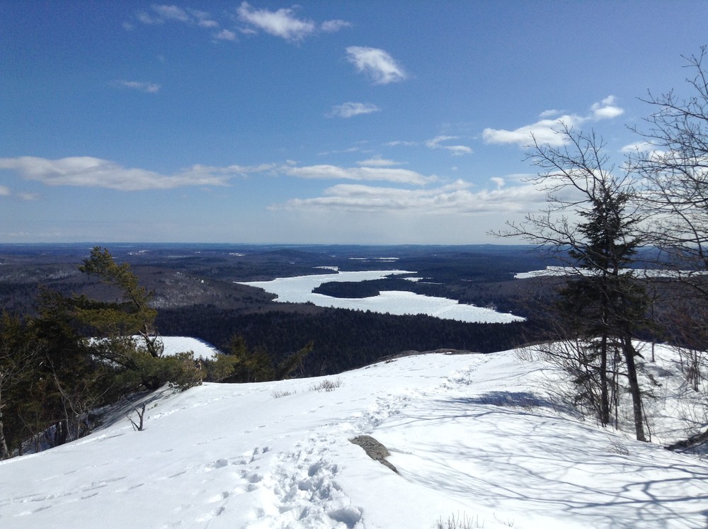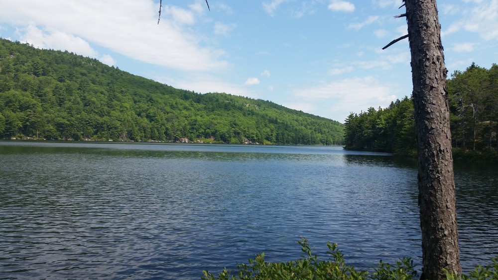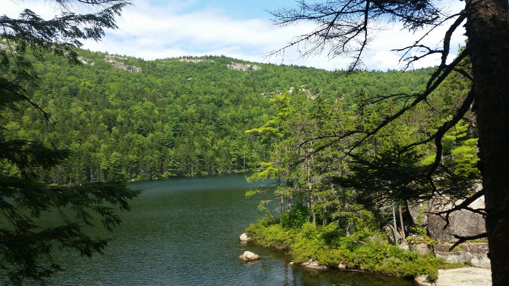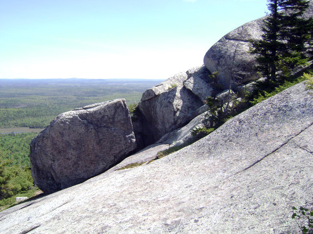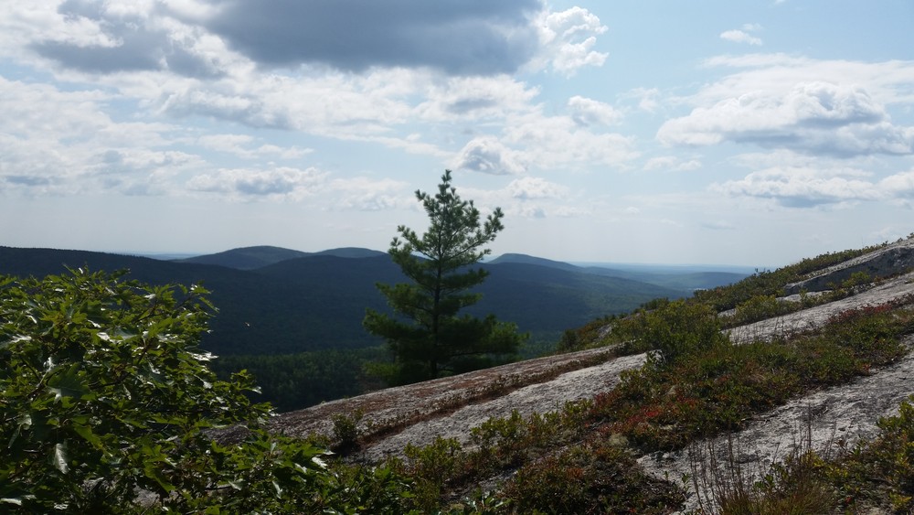 Those going on to climb Tunk Mountain pass Mud Pond and quickly start climbing, steeply at times. The forest becomes predominantly softwood at and above Mud Pond. A small mountain stream is crossed and the trail slabs up a series of rises. Filtered views grow as one climbs. At 1.3 miles from the trailhead, a wide vista opens up on a set of treeless ledges. This vista point provides a compelling view of the ponds below, the hills beyond, and a portion of the downeast coastline.