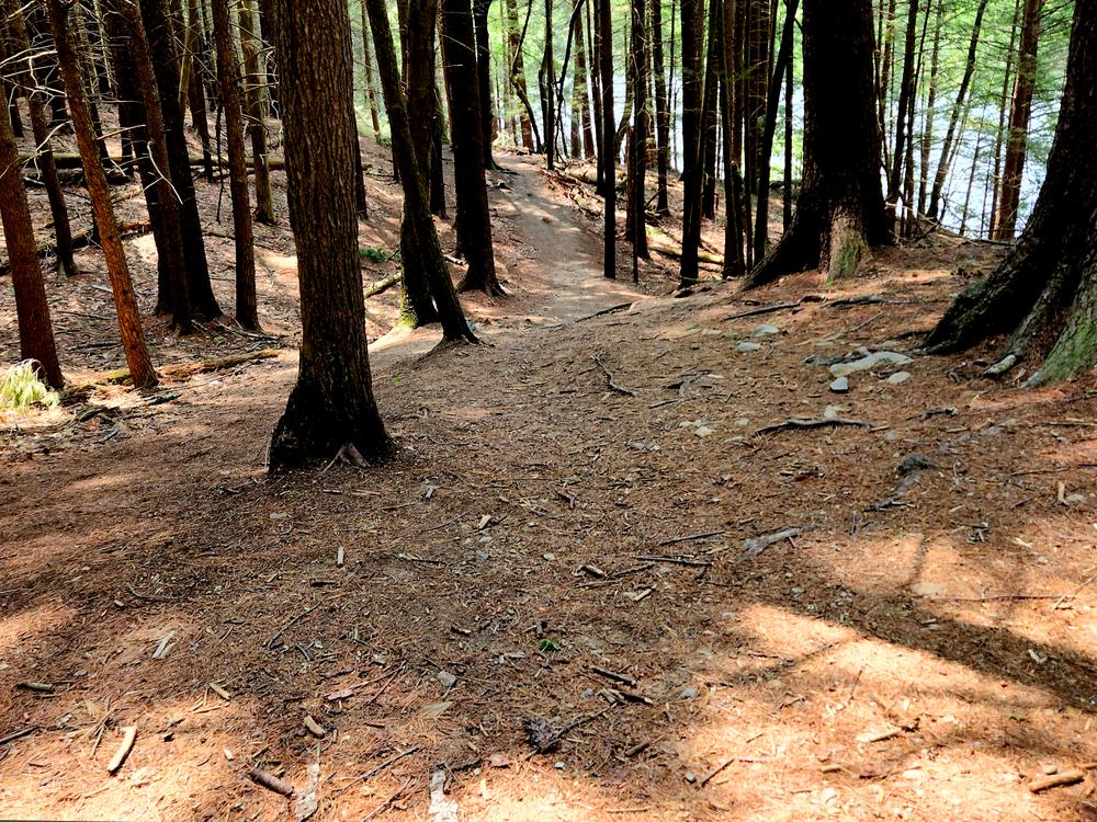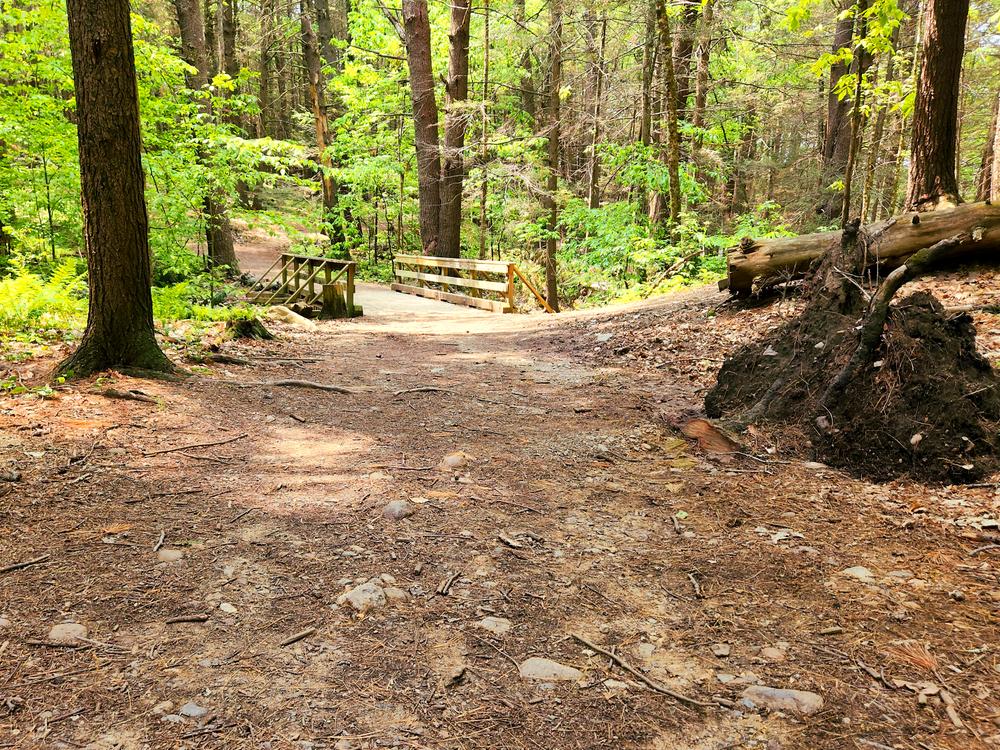 The Bridle Path Trail (0.7 miles) veers off from the River Run Trail. It is extremely steep, dropping 150 feet to the river. There are majestic old growth pine and hemlock trees along this trail, many of which are more than a century old.