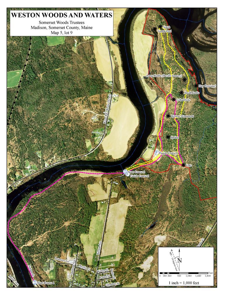 Weston Woods & Waters consists of about 300 mostly wooded acres, encompassing a total of about 2.5 miles of Kennebec River frontage. One of the principal trailheads (with a parking lot) is at the well-established Nathan Street Boat Launch. From here, hikers can access the Main Street Connector and travel 0.25 miles to Main Street. Or, access the River Trail which runs north for 1.5 miles to the Weston Avenue trailhead. Throughout most of this stretch the trail is wide and flat, only a few meters from the water, affording peaceful views across the river.