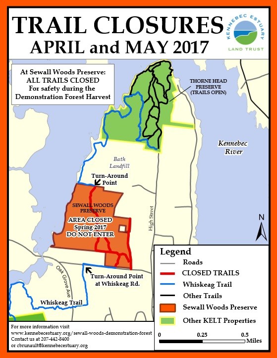 Sewall Woods Preserve: From the intersection of High Street and Center Street in Bath, take High Street north 1.5 miles and turn left onto Whiskeag Road. Take the next right into the parking area and trailhead for Sewall Woods Preserve.