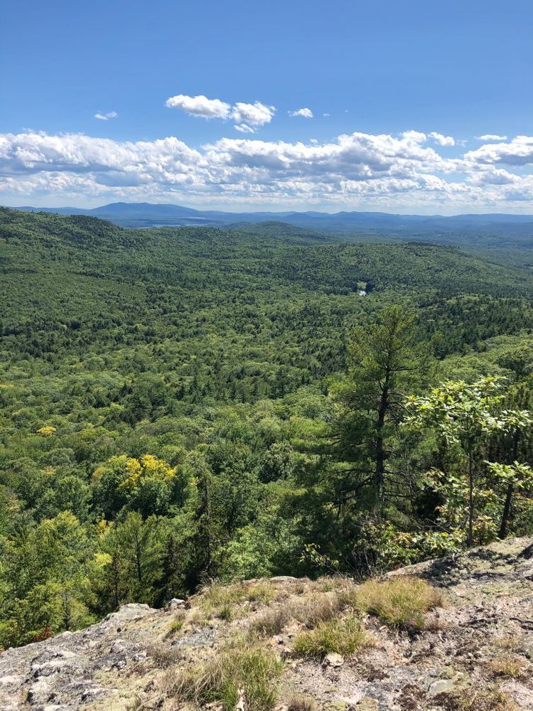 The Deer Hills Trail crosses Cold River over a concrete dam before passing the junctions with Leach Link Trail and Deer Hills Bypass. The trail continues straight ahead and climbs moderately before crossing over ledges and reaching the summit of Little Deer Hill. There are two trails that descend to join the Deer Hills Bypass or continue on the Deer Hills Trail to the summit of Big Deer Hill. From the summit of Big Deer Hill the trail continues down the south ridge which provides several fine outlooks before meeting the junction with the Deer Hills Bypass. From here, take the Deer Hills Bypass to the Baldface Circle trailhead or continue south to the western terminus of the Deer Hill Trail on Deer Hill Road. There are several trails that access the Deer Hills, allowing for a multitude of loop opportunities of varying distances.