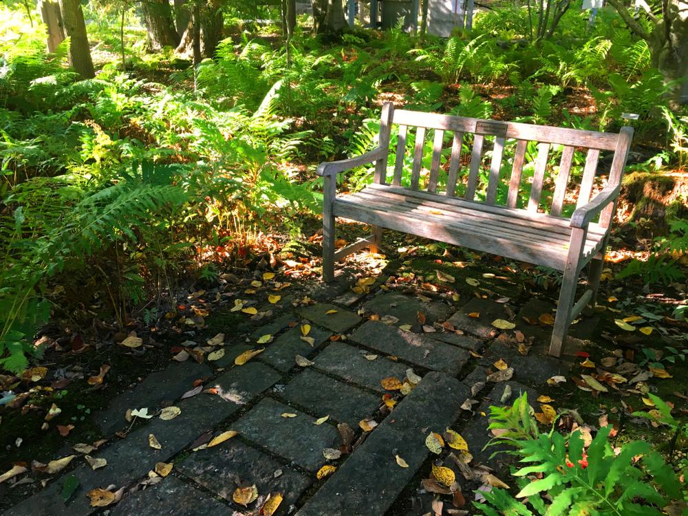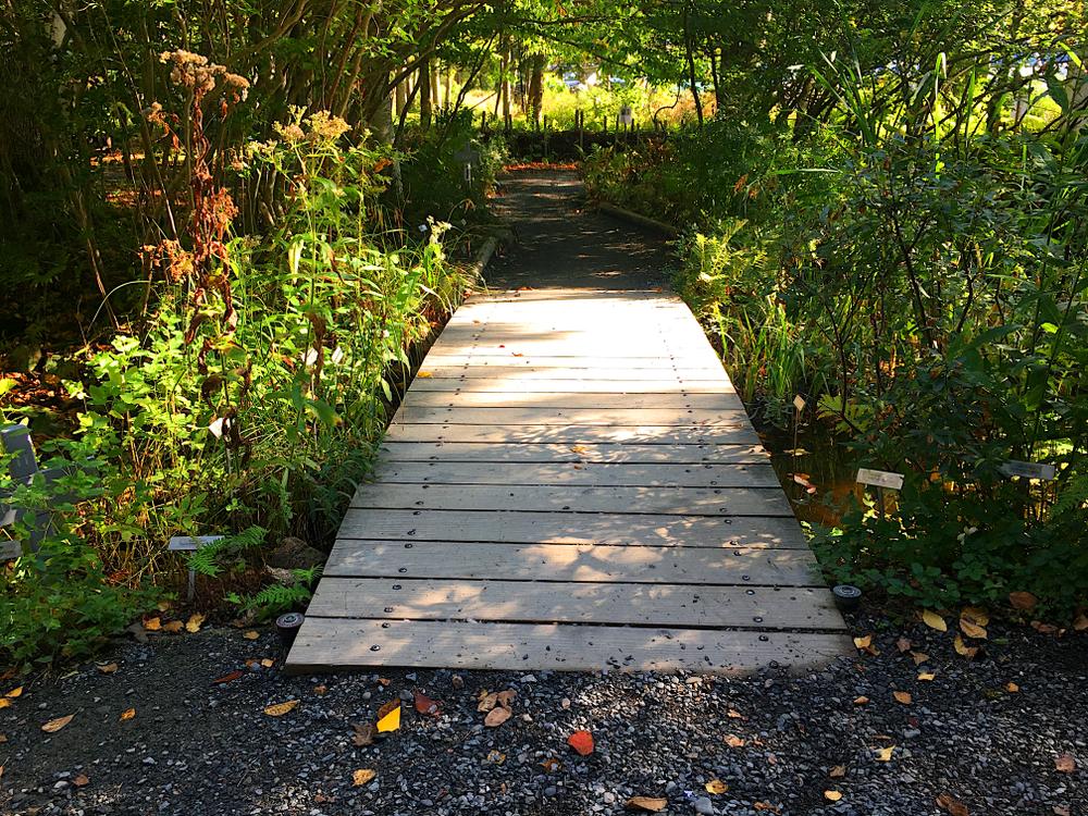 There is a wooden bridge near the north end of the garden, which is about three and a half feet wide, with a smooth transition to the paths on both sides, a very slight rise in the middle.