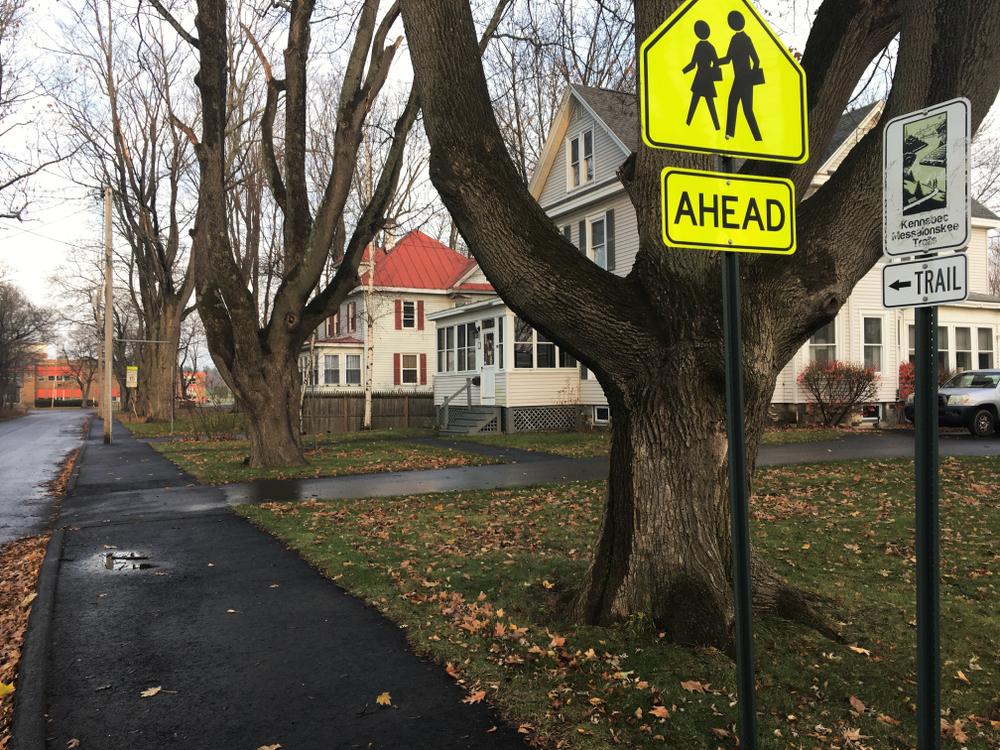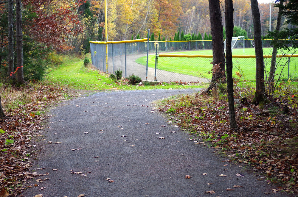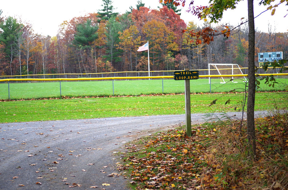 The trails include loops around the school ball fields and another loop through the woods. From the school campus, the trail continues on Choate and Stobie Streets to Scott Park on Benton Avenue, then around the park on a paved trail connecting to Two Cent Bridge.