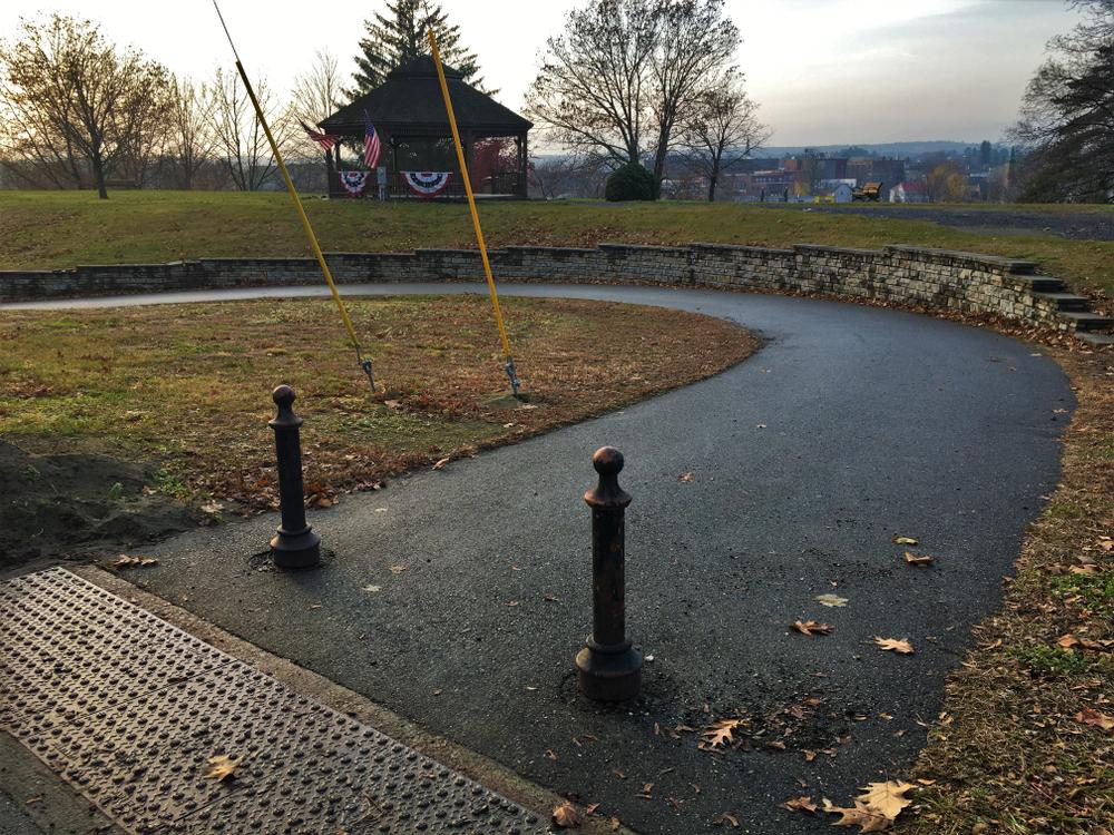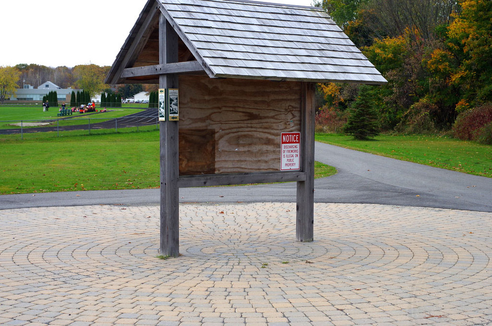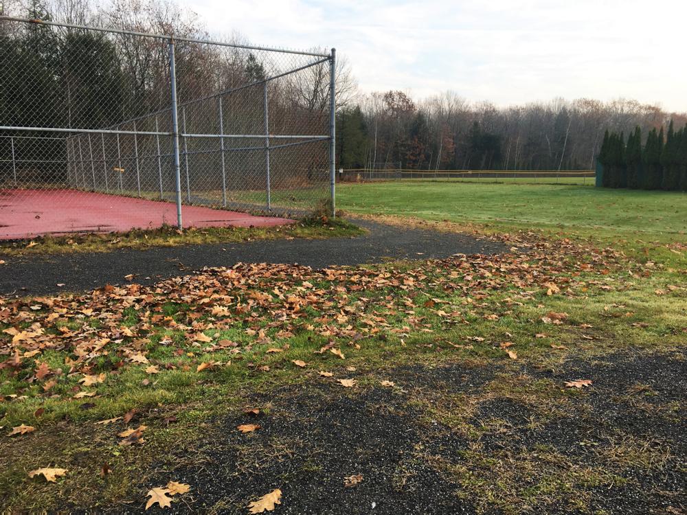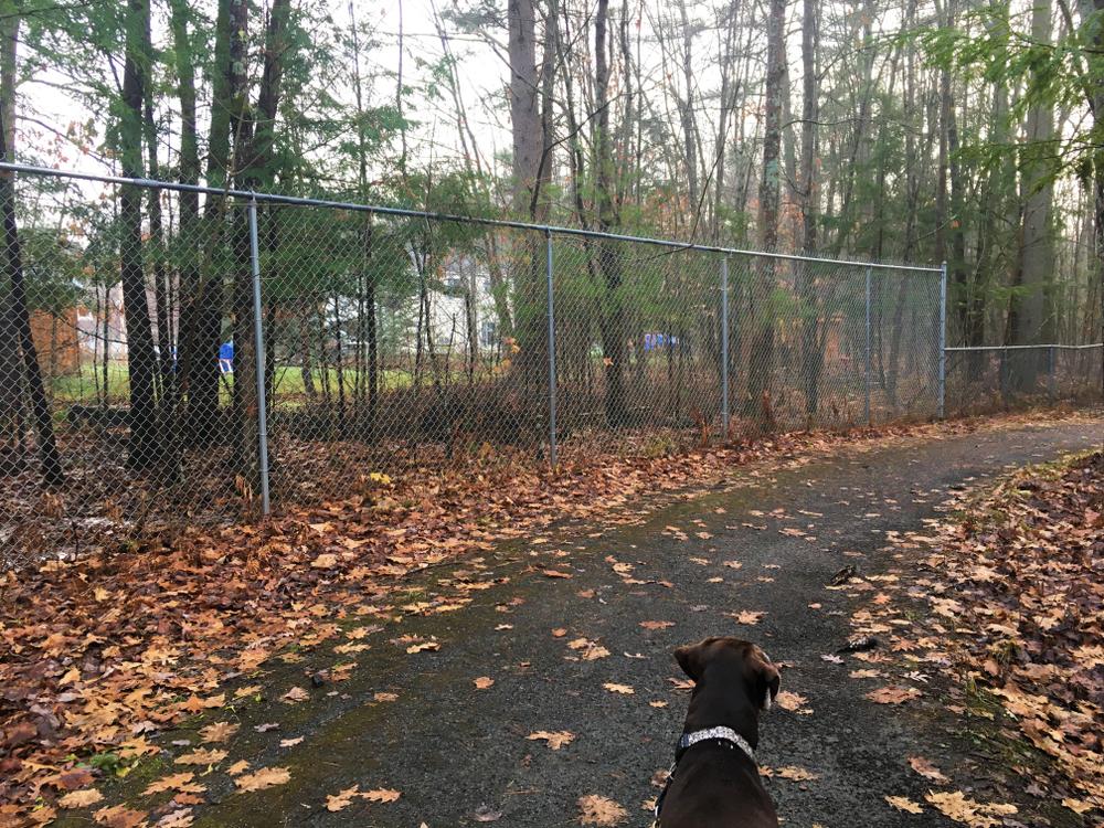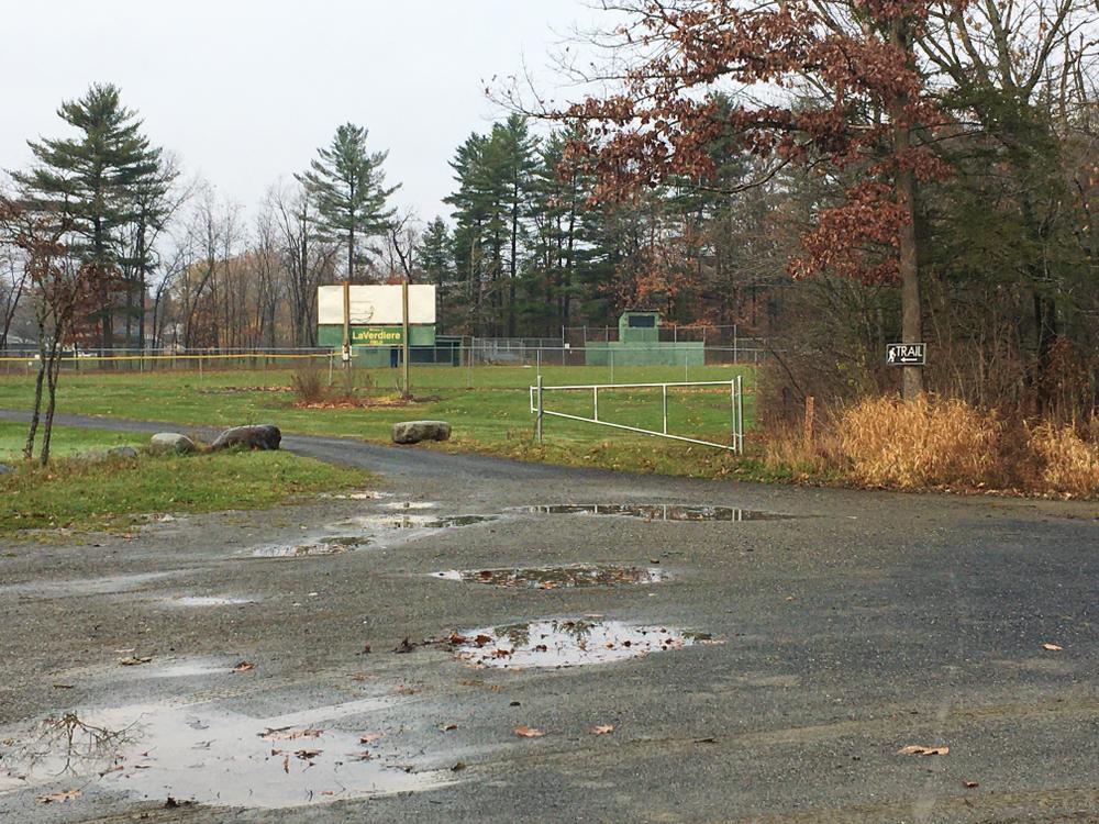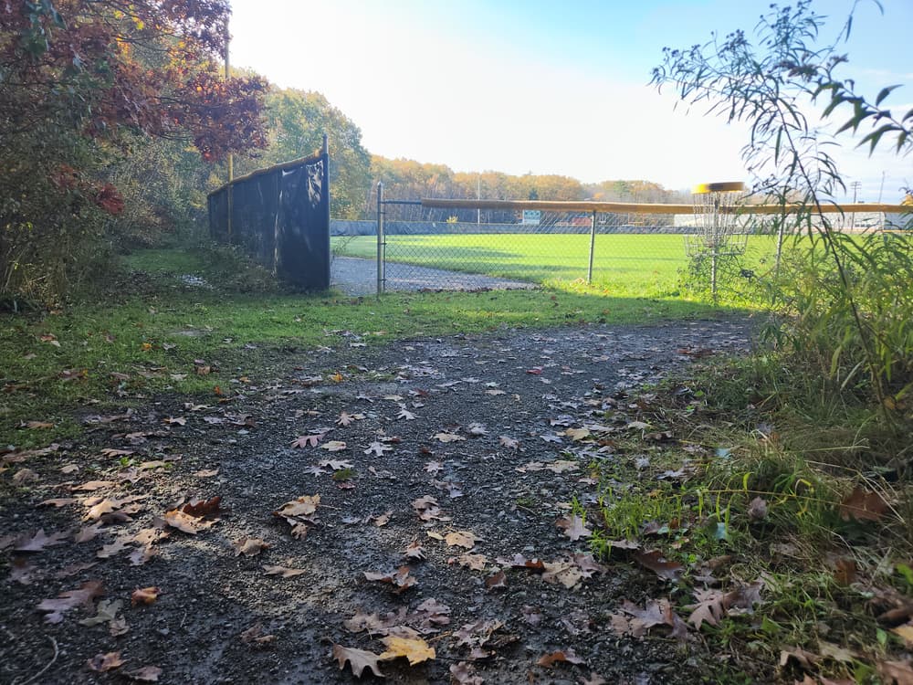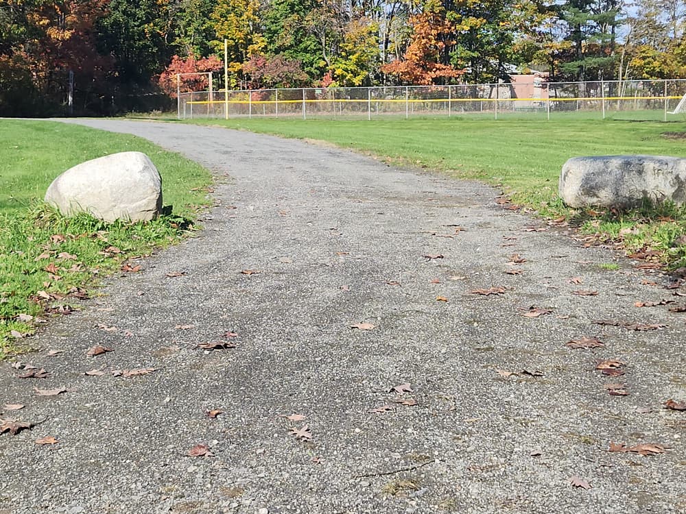 The trails can also be approached around the tennis courts back of the High School on Danielson Street, or along a paved trail past the Junior High School.  At this eastern trailhead behind the Junior High School, there is some grass between the gravel parking lot and east end of the loop.