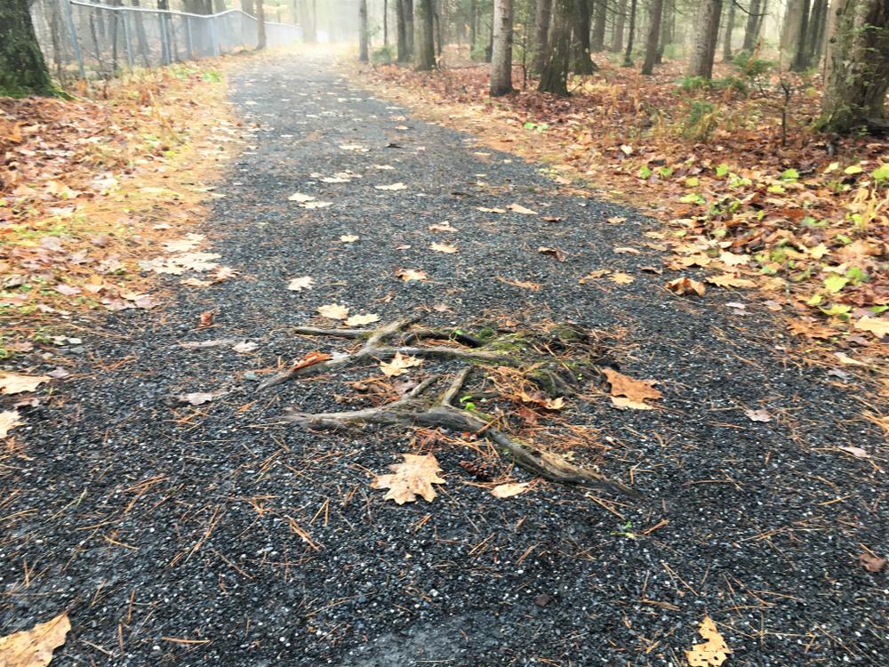 These school and community trails are a great place for an outdoor classroom,  a daily jog or stroll. The hard-packed surface with slopes generally under 3% is suitable for strollers, wheelchairs, and those who use mobility assistance equipment. It's a wonderful place to learn to ride a bike. The trails are typically about 8 feet in width with a couple of spots that narrow to 3 feet through the woods. There are rocks placed at the trailhead with 7 feet between them. The hard-packed gravel surface does not have roots or rocks except for one spot of roots, which could be easily navigated over or around by most. There is a section of trail that sometimes gets flooded in wet weather, effectively cutting the width of the trail in half.