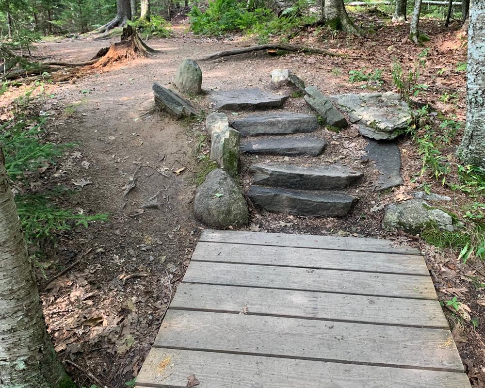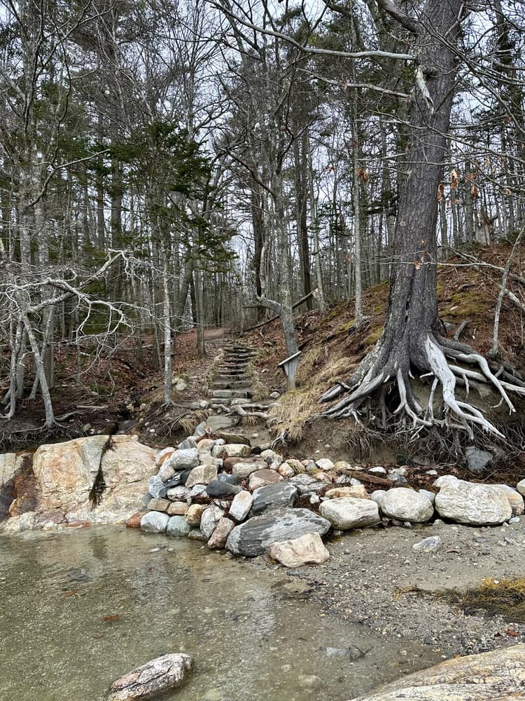 The White Pines trail is 5+ feet wide, accessible, and barrier-free with a firm gravel base. It follows the shoreline of Casco Bay, crossing several bridges with benches and interpretative panels along the way. This trail's terminus is located near the osprey nest on Googins Island, which sits about 200 yards off the coastline of the park. This trail is suitable for visitors in wheelchairs or with strollers.