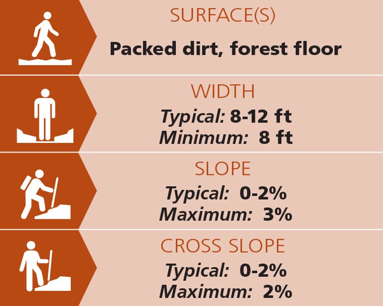 The 0.06-mile Story Trail and 0.6-mile Gander Trail are 8-12 feet wide and flat, with slopes remaining under 3%. These two trails are most easily accessed from the south trailhead; the connecting trail from the south trailhead includes cross slopes of 5% and significant roots across one place in the trail. See Trail Access Information & Considerations below for more details on these access(ible) experiences.